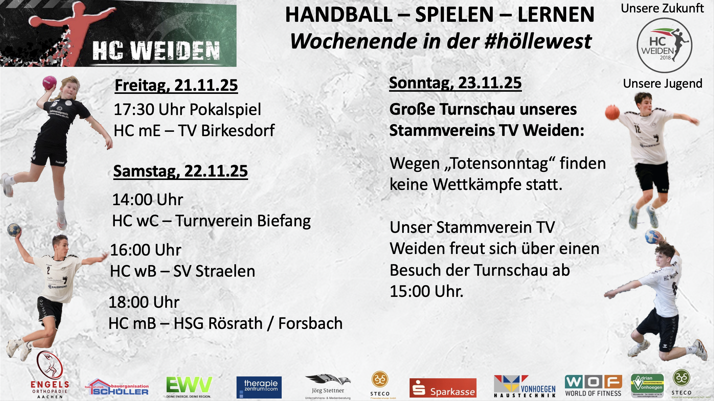 Der Samstag steht im Zeichen unserer überregional aktiven Jugendteams, Sonntag finden keine Handball-Wettkämpfe (Totensonntag) statt.